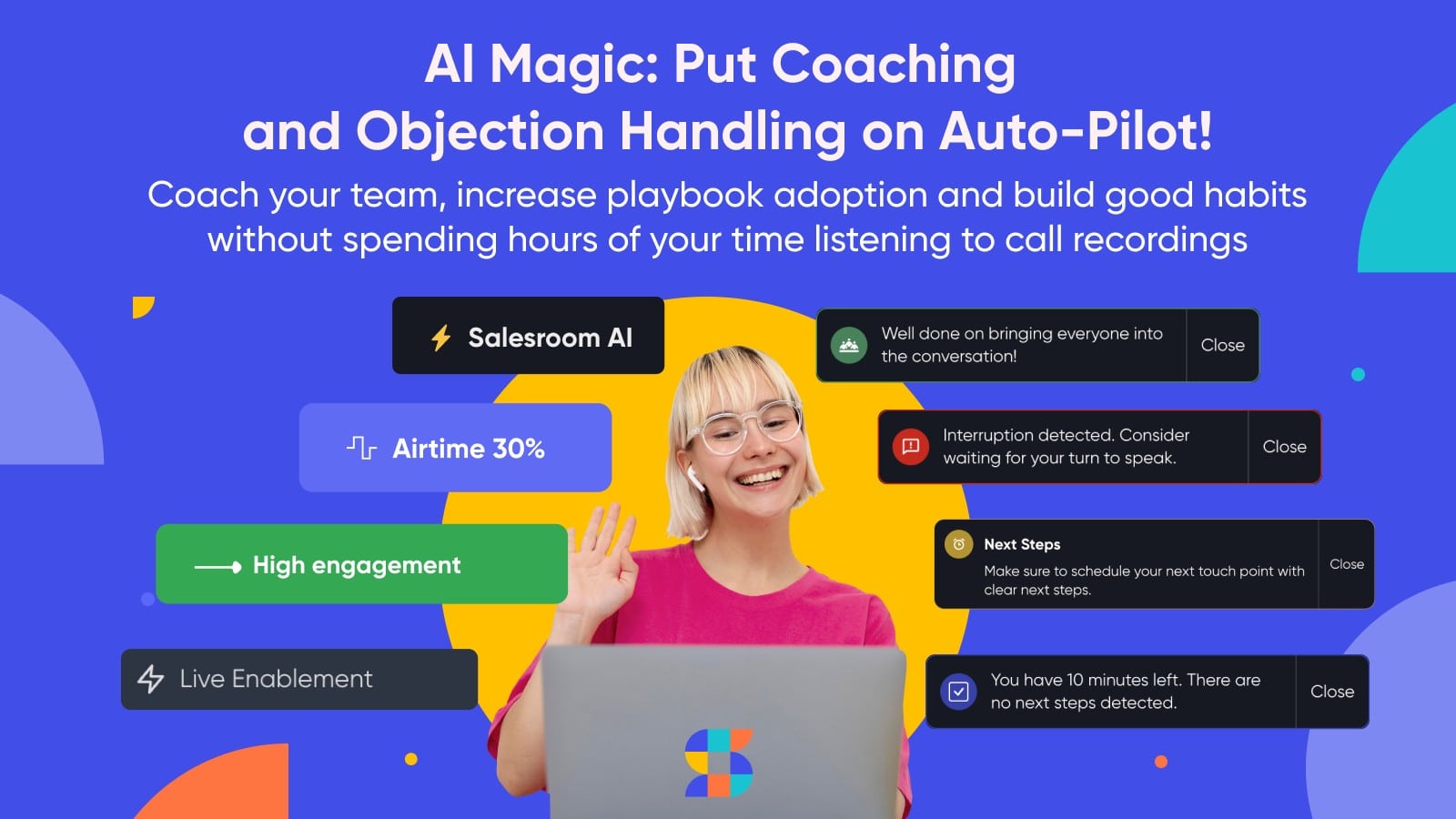 - Automate coaching with smart cue cards, helping reps overcome objections and improve virtual communication skills.